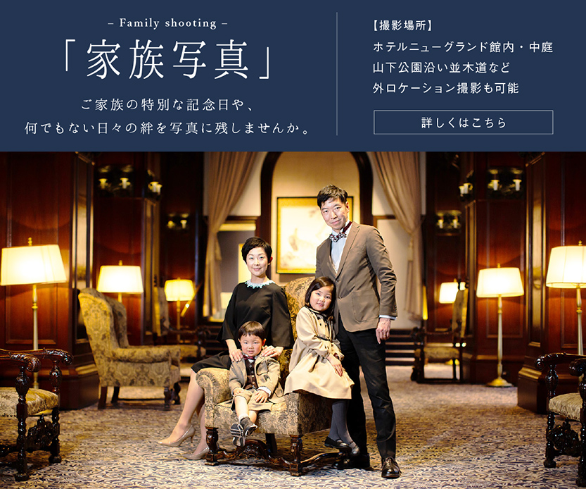 ※ホテルニューグランド館内でのロケーション撮影は、ご披露宴パーティー、テレビ、映画、CMの撮影等の状況により、お時間のご変更や撮影中止となる事もありますので、予めご了承いただけますようお願い申し上げます。